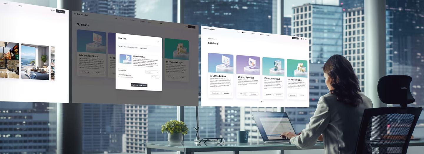 Select and purchase or subscribe to the necessary solutions based on quantity, type, grade, and duration of licenses according to the usage environment, similar to buying products online. Solutions purchased or subscribed to can be easily integrated with LG devices* on the same website.