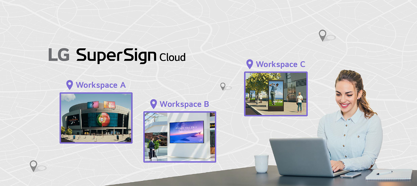LG SuperSign Cloud is a cloud-based CMS (Content Management Solution) for integrated digital signage management. Through LG SuperSign Cloud, users can remotely control multiple displays*, create and distribute content tailored to each space anytime anywhere without being restricted by time and location**.