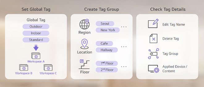 Users can monitor the overall tag list in a single view to check which tags have been assigned to each device or content. Additionally, users can group individual tags into tag groups or create a global tag that is used across the entire workspace.